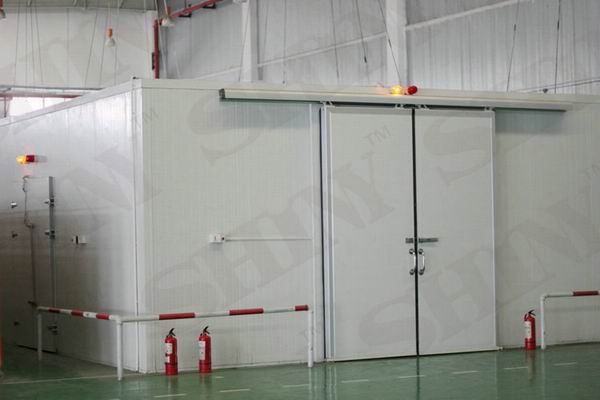 室外装配式冻库均为钢骨架结构,并辅以隔热墙体、顶盖和底架,其隔热、防潮及降温等性能都基本类同于土建式冻库。室外装配式冻库的库容一般为500T以上,建筑成独立的建筑物,库内净高多大于3米。
